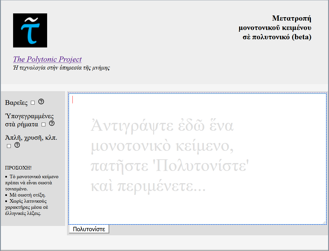Ἕνα διαδικτυακὸ πρόγραμμα ποὺ μετατρέπει ἤδη πληκτρολογημένα καὶ ἐλεγμένα μονοτονικὰ κείμενα σὲ πολυτονικά